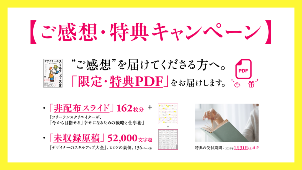 いまだけ! よりよいデザイン成長ができる、【限定の非配布スライド・未収録原稿、お届け】キャンペーンのお知らせです。